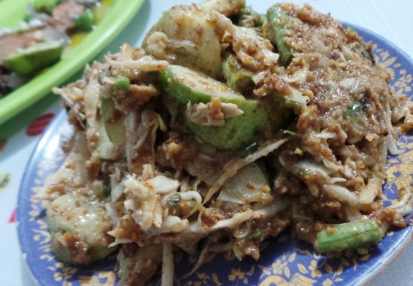 Nasinya yang lembut yang dicampur dengan mie diberi suwiran ayam, usus goreng dan bawang goreng. Makin enak dilengkapi dengan potongan telur rebus goreng dan sambal rawit yang pedas. Hmm, enak dengan tambahan lalapan timun segar!